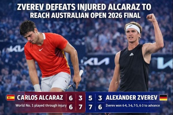 Match Score (Australian Open 2026 Semifinal): Alexander Zverev def. Carlos Alcaraz Score: 6–4, 3–6, 7–5, 6–3 Result: Zverev won the match and advanced to the final Note: Carlos Alcaraz played with an injury during the later stages of the match Alexander Zverev reached the final of the Australian Open 2026 after defeating Carlos Alcaraz in…