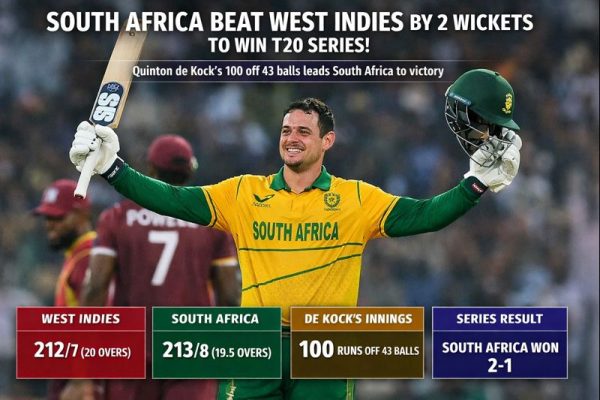 Match Score Summary: West Indies: 212/7 (20 overs) South Africa: 213/8 (19.5 overs) Result: South Africa won by 2 wickets Player of the Match: Quinton de Kock South Africa defeated West Indies by 2 wickets in a high-scoring and exciting T20 match to win the T20 series. The match went down to the final over,…