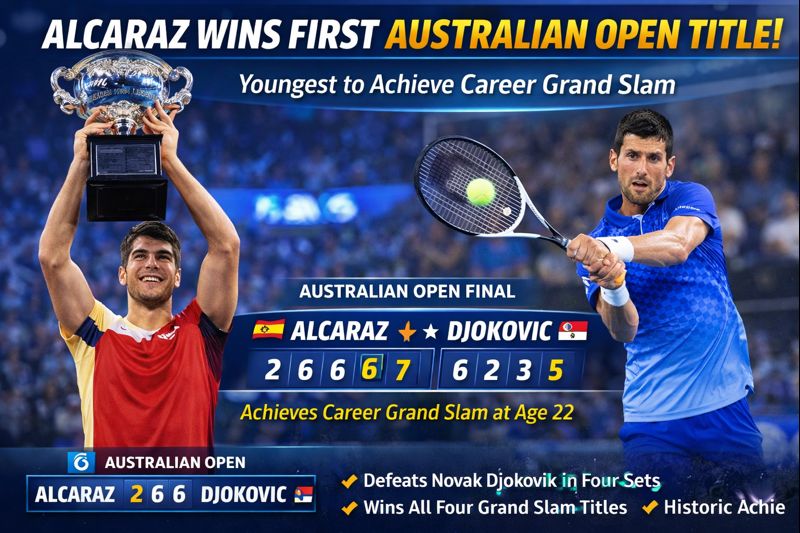 Carlos Alcaraz wrote a new chapter in tennis history by winning the 2026 Australian Open men’s singles final against Novak Djokovic. The Spanish star defeated the 38-year-old Serbian with a score of 2–6, 6–2, 6–3, 7–5 to claim his first Australian Open title and complete the career Grand Slam — winning all four major tournaments…