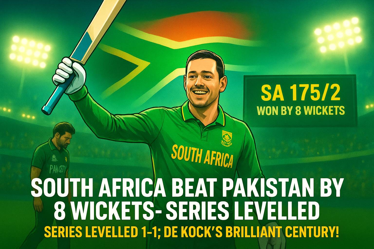 South Africa delivered a dominant performance to defeat Pakistan by 8 wickets, leveling the T20 series 1-1. Chasing a competitive target set by Pakistan, the Proteas displayed great composure and power, led by Quinton de Kock’s magnificent century.